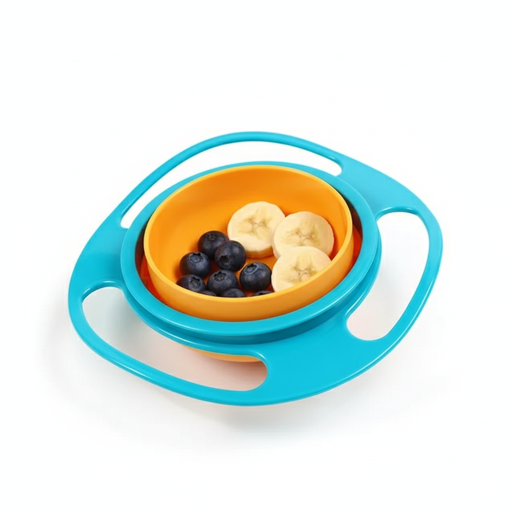 De Kinderkom wordt geleverd met een anti-morsontwerp waarbij de binnenkom 360° draait in gyroscopische beweging om voedsel binnen te houden en morsen te voorkomen. Het heeft ook 3 handvatten voor gemakkelijk dragen en een deksel om voedsel af te dekken wanneer het niet in gebruik is. Zo blijft het eten ín de kom, ook als je peuter wiebelt, draait of de kom ondersteboven houdt.